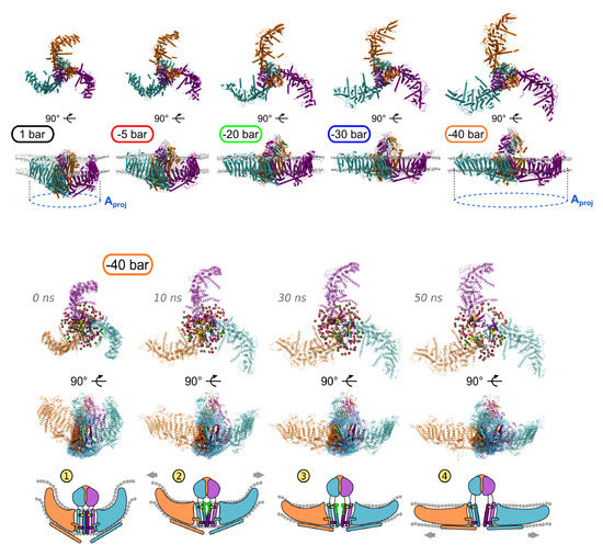 Membrane tension applied to Piezo1 channel via molecular dynamics simulations. In the upper panel, top and lateral views of Piezo1 channel flattening upon increasing membrane tension, up to −40 bar. In the lower panel, a sequence of snapshots from MD simulation at −40 bar, extracellular top view and lateral view, and cartoon representation explaining the Piezo1 activation mechanism coupled to membrane tension. Grey arrows indicate membrane tension and Piezo1 blade expansion. Adapted from [208], under CC–BY–NC–ND 4.0 International license.