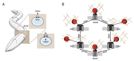 Gating mechanism of MeT channels in C. elegans touch receptor neurons (TRNs). (A) Schematic representation of the forces acting on TRNs in consequence of cuticle indentation. (B) Schematic representation of a possible gating model of MeT channels. An elastic filament links the channel to an anchor that moves in the extracellular matrix [213]. In clockwise order from top to bottom: a deformation applied to the extracellular matrix causes a lateral shift between the anchor and the matrix and induces a stretch of the filament that activates the channel. Viscoelastic forces allow the filament to return into its relaxed state, inducing the channel adaption and closure. When the external deformation is released, a second lateral shift of the anchor with respect to the extracellular matrix occurs, resulting in the channel opening. Finally, the initial configuration is restored by viscoelastic forces. Figure adapted from [213] under the exclusive License to Publish.