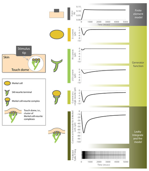 Schematic representation of multiscale model of Merkel cell-neurite complexes. The top panel on the right shows the stimulus applied to the skin. SI and USI represent the slowly–activating current arising from the Merkel–cell and the ultra–slowly–inactivating from the neurite terminal. The generator function includes the three currents and the compressive stress and uses as input the compressive stress calculated from the stimulus force (top panel) through a finite–element model. The simulated currents for a single Merkel–cell are summed to obtain a heminode constituted by eight Merkel–cell neurite complexes. Reproduced from [221] under the CC BY license.