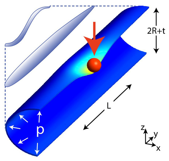 Schematic representation of C. elegans body and mechanics. A cylindrical shell 1 mm long and with a radius of about 25 m is used. Such a shell is indented by the application of a spherical bead. The symbol t denotes the thickness of the shell. Reproduced from [223] under the CC BY license.