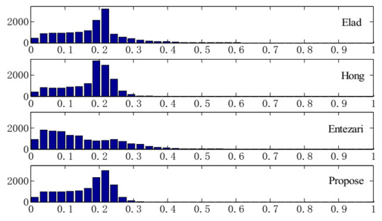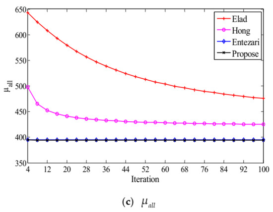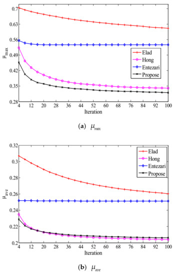 Figure 2 illustrates the change tendency of mutual coherence indexes with iteration number for . As can be seen from the figure, the indexes corresponding to different algorithms all change monotonously with the iteration number. When and converge, the number of iterations required by our method is almost equal to that of Hong and significantly less than that of Elad. When converges, the number of iterations required by our method is equivalent to that of Entezari and significantly less than that of Hong and Elad.