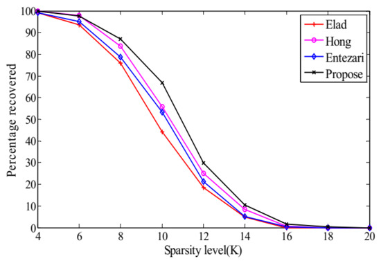 - Tropp, J.A.; Gilbert, A.C. Signal Recovery from Random Measurements Via Orthogonal Matching Pursuit. IEEE Trans. Inf. Theory 2007, 53, 4655–4666. [Google Scholar] [CrossRef]
