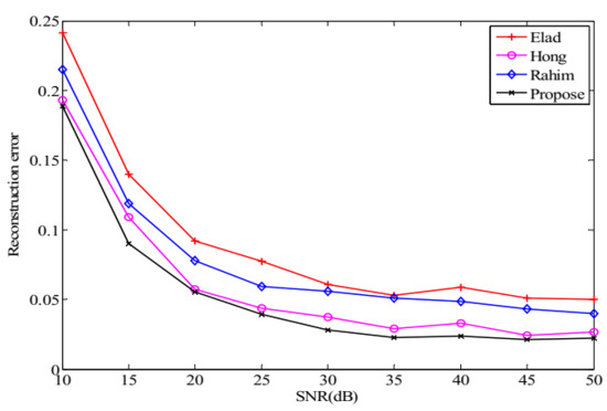 To show the robustness of the proposed method in noisy cases we consider the noisy model where is the vector of additive Gaussian noise with zero means. We conduct the experiment by fixing , , and varying SNR from 10 to 50 dB. The experiment is performed for 1000 random sparse ensembles and the average reconstruction error is recorded. From Figure 6, we can see that the reconstruction errors decrease with the increase of SNR, and the error of the proposed method is smaller than that of the others.