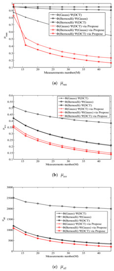The mutual coherence indexes of different measurement matrices with different dictionary matrices are shown in Figure 7. As seen from the simulations, all the optimized measurement matrices produce smaller , , and than the random ones.