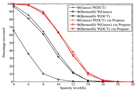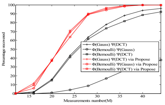 Figure 8 and Figure 9 present the reconstruction performance of OMP with the optimized measurement matrices and the random ones. It is seen from the graphs in these figures that all the optimized matrices outperform the random ones in terms of the percentage of exact reconstruction.