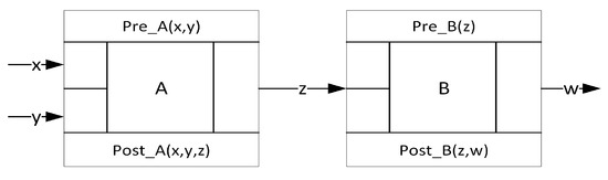 A condition data flow diagram (CDFD) is a directed graph that specifies how processes work together to provide functional behaviors [41]. Every process has its own pre- and post-conditions. For instance, Figure 1 displays a small CDFD that consists of two processes A and B where process A first consumes two input variables x and y and produces output z, and then process B consumes z and produces w.
