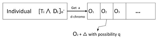 To perform the mutation operator, each genetic of an individual is mutated with possibility q, as displayed in Figure 3. More clearly, for one individual with its d-chromo , each genetic of it has the possibility q to be mutated: