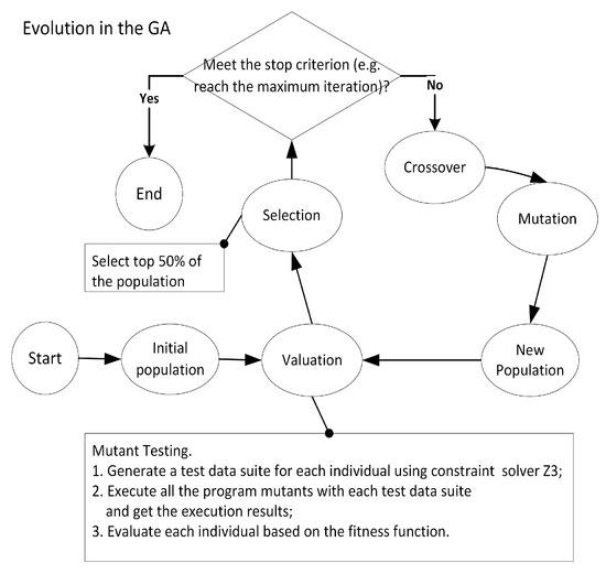 The techniques of mutation-based test data generation [27,28] are used to select a set of “good” test data by executing designed incorrect versions of an original program with a great number of test data from the domain. Test data are selected if it can cause unintended behaviors for a certain number of incorrect versions. These techniques mainly concentrate on designing appropriate mutation operators to introduce small modifications for different kinds of programming languages such as Java [29], C# [30], and C++ [31]. The incorrect versions, also called program mutants, are created by inserting the mutant operators into the original program. Compared with these techniques, our method selects a set of “good” mutated specifications as a seed for further test data generation by using not only program mutants but also the mutated specifications with the GA.