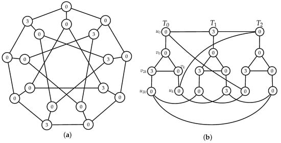 Note that by Proposition 1, we can restrict attention to the DRDF of a graph G with no vertex assigned the value 1. Furthermore, it is easy to see that DRDF of a given graph is not unique. For example, has DRDF’s with value 3 on two vertices and DRDF’s with value 2 on three vertices. Here we will, without loss of generality, consider -functions with minimal . In Figure 1, a DRDF of is given that has minimal number of vertices in , in fact . On the left (a), the usual drawing is given, while on the right (b), we introduce another way of drawing that will be used in the sequel. The vertices are organized according to the triangles, . Vertices of triangle and its neighbors, , are indicated in Figure 1b.