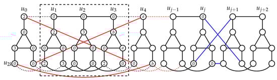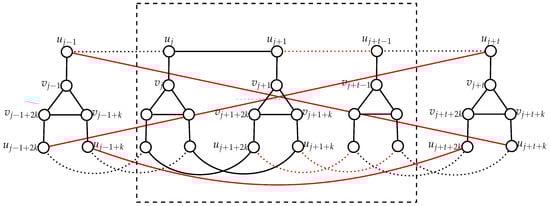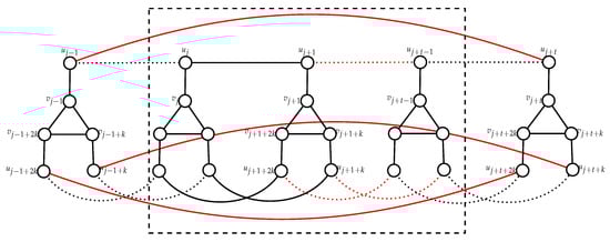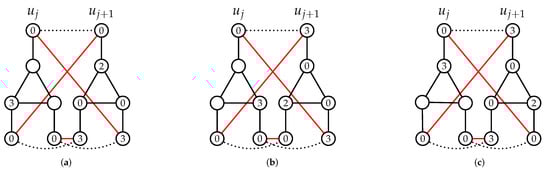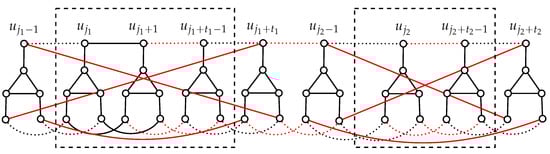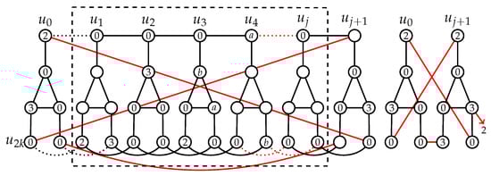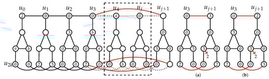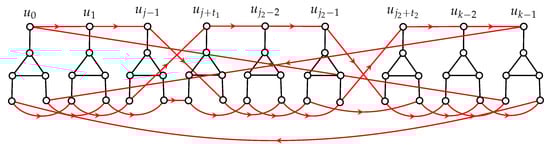 Result of Algorithm C is illustrated on Figure 6. Consider a cycle (see Figure 7 with red arrow lines). Now we relabel the vertices of as and consider a function with and for each . It can be verified that h is an isomorphism from to , and the proof is complete. □