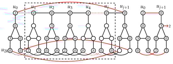 Figure 11. Case 2.2 of Lemma 9: .Case 2.3: Let . Then and (.We apply Algorithm A with and on a graph , and by Lemma 2, for the resulting graph we have (see Figure 12). Now we let , additional we set either if , or if (see Figure 12, cases a,b); hence, all vertices of and are DR-dominated in a graph . Similarly as before, in both possibilities, there exists a DRDF of with ; hence, . Recalling the assumption that for each , it follows leading to contradiction.