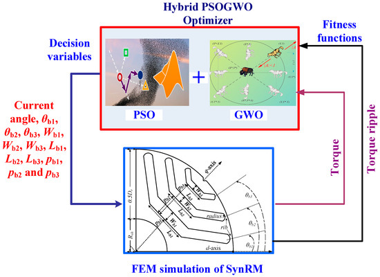 In this paper, the hybrid particle swarm optimizer and grey wolf optimizer (PSOGWO) algorithm was used to determine the best parameters in order to obtain the optimal rotor design of the SynRM. The following paragraphs briefly describe the core idea and the updating process of the PSO, GWO, and hybrid PSOGWO.