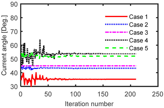 Figure 3, Figure 4, Figure 5 and Figure 6 show that the steady-state response of the optimization process was not delayed considering the current angle, while in some cases, the response became even faster. The optimization process of cases 1 and 4 reached its steady-state after about 80 and 60 iterations respectively compared to about 70 iterations for the third case. In contrast, the fifth case had a slower performance as shown in the zoomed view of Figure 4.