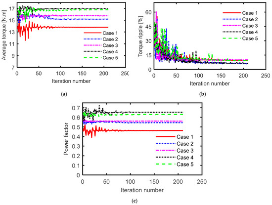 (a) Average torque, (b) torque ripple, and (c) power factor versus iteration number for different cases.