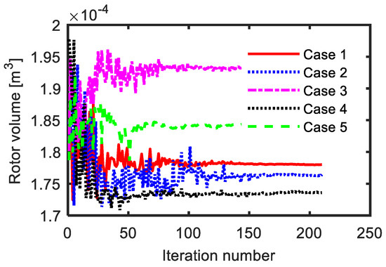 As mentioned before, five different ranges of the current angle were considered (see Table 3). For each case, the range of the current angle was set and the optimization process was completed. The number of designs for each case was 210. Figure 3 shows the variation of current angle versus iteration number during the optimization process for different cases. The cost function versus the iteration number is reported in Figure 4. Figure 5 shows some performance indicators of the SynRM for different cases. Notice that the results in this section were obtained at different current angles. Therefore, it was not possible to compare the performance indicators of the five cases. However, this will be done in the next section. Moreover, it was proved from Figure 5 that the average torque and the power factor were greatly affected by the value of the current angle in a specific case (between different designs), while the impact on the torque ripple was lower. Figure 6 and Table 4 reveal that the iron volume of the obtained rotor geometry depended on the considered current angle during the optimization process. Figure 6 shows that the third case, which considered a fixed value for the current angle (45°), gave the largest rotor iron volume, while the fourth case, which considered sufficient range of current angle variation in which the current angle of maximum torque and minimum torque ripple of the SynRM existed, gave the lowest iron volume of the rotor. The rotor iron volume of the third case was about 11% higher than that of the fourth case. This meant that the inertia of the SynRM based on the fourth case was lower resulting in a fast-dynamic machine.