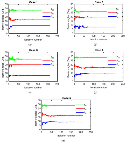 Figure 7, Figure 8, Figure 9 and Figure 10 and Table 4 show the final optimal geometry of the rotor flux-barrier angles, lengths, widths, and positions for different cases. In Figure 7, it is found that the flux-barrier angles were greatly varied when considering different ranges of current angle during the optimization process. For example, in the first case (with current angle range from 30°: 40°), the flux-barriers angles changed by about 2° to 6° compared to the optimal geometry proposed in [26] and by about 2° to 3.5° compared to the third case. However, when the current angle was kept fixed to 45° in the third case during the optimization process, the obtained optimal geometry for this case was different compared to the optimal geometry presented in [26] which used a current angle equal to 56.50°. This proved that the optimized geometry was sensitive to the chosen value of the current angle for fixed current angle cases.