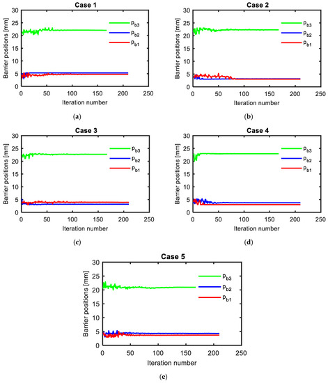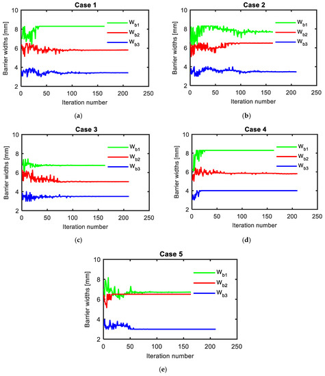 Optimal geometry of flux barrier widths for different cases, (a) case 1, (b) case 2, (c) case 3, (d) case 4 and (e) case 5.