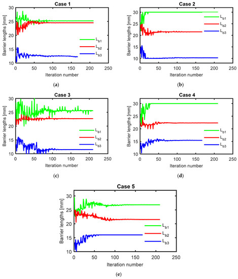 Optimal geometry of flux barrier lengths for different cases, (a) case 1, (b) case 2, (c) case 3, (d) case 4 and (e) case 5.