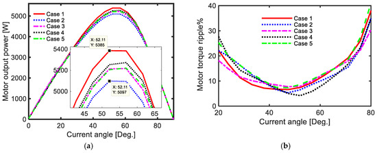The performance of the optimal geometry of the rotor of the three-phase SynRM for different case studies was studied and compared using finite element magnetic simulations. The optimal geometry for each case is shown in Table 5. Figure 11a shows the output power of the three-phase SynRM for different cases at rated conditions (speed = 3000 rpm and RMS current = 12.23 A) and at different current angles. It was been found from Table 5 and Figure 11a that the first case gave the highest output power and the second case gave the lowest output power at the rated condition and at the optimal current angle. The optimal current angle was the angle that maximized the output power. The optimal current angle was 52.11° for both the first, the second, and the third case as shown in Figure 11a and Table 5, while it was 56.8° for the other cases. The output power in the first case was 5.65% higher than the second case. Moreover, the first case had about 3.32% higher output power compared to the third case. Note that the current angle in the third case was fixed during the optimization process while the effect of the current angle was considered in the first case as discussed in the previous section.
