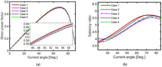(a) Motor power factor and (b) saliency ratio at different current angles and at rated conditions for the optimal geometry of different cases.