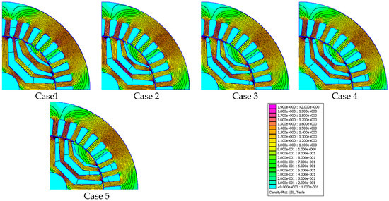 Figure 12 shows the power factor and the saliency ratio for the optimal geometry for different cases studied at rated conditions and at different current angles. It is noted that the fourth case had the highest value of the power factor. It was 0.6628. This was due to its higher optimal current angle compared to the first case. The power factor of the first case was 0.6297. Figure 12b shows that the first case gave the highest saliency ratio and the second case gave the lowest saliency ratio. In addition, the saliency ratio of the first case was about 11.7% higher than its value in the third case. The distribution of flux density at the same instant of the optimal geometry is shown in Figure 13 for the various study cases. It was been found that the rotor geometry calculated from the first case had less saturated area compared to other studied cases.