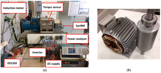 Figure 14a shows a complete experimental test bench to validate the simulation results presented before. It consisted of a 5.5 kW three-phase SynRM with a 36-slot stator and four-pole rotor as in case 4. The stator and the rotor are shown in Figure 14b. The three-phase SynRM was coupled with a 10 kW three-phase induction motor. The SynRM implemented in this paper required a control system, as it had no rotor cage. Hence, the desired speed of the three-phase SynRM was achieved using an induction motor, as the three-phase SynRM worked in the mode of torque control. A three-phase inverter based on space vector modulation with a 6.6 kHz switching frequency and 600 V DC bus voltage was used to control the three-phase SynRM. A digital signal processing (DSP1103) was used to obtain the required switching pulses. Incremental encoder and torque sensor were used to measure the rotor speed and the average torque respectively. The input electrical power for the three-phase SynRM was computed using a power analyzer.