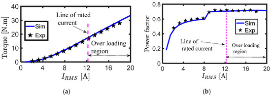 (a) Average output torque and (b) power factor at different line currents, at an optimal current angle, and at .