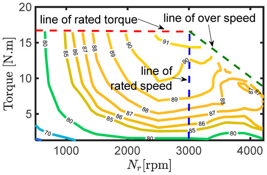 Figure 17 shows the measured and simulated values for the efficiency and total losses of the SynRM at different line currents, at rated speed, and at an optimal current angle. There was a slight difference between the simulated and measured values of efficiency and losses. This was due to neglecting the effect of mechanical and switching losses and the inaccurate iron loss simulation model parameters. Figure 18 shows the efficiency map of the complete drive system at different rotor speeds and at optimal current angles including the flux weakening region.