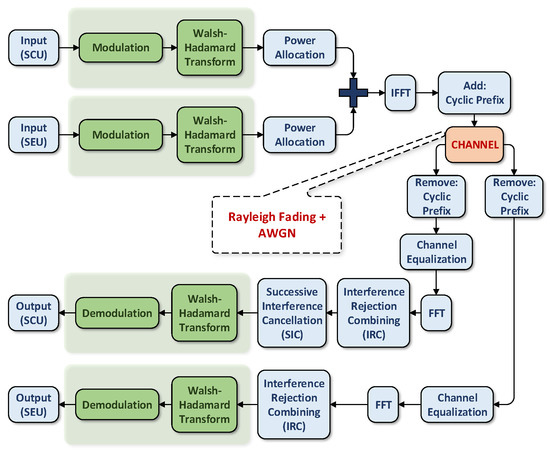The remainder of this paper is structured as follows. Section 2 describes the mathematical model of the system with the details of the joint strategy, i.e., WHT with NOMA and IRC, considering both ideal and nonideal SIC cases. Section 3 reports the simulation results of the proposed strategy, and final concluding remarks are provided in Section 4.