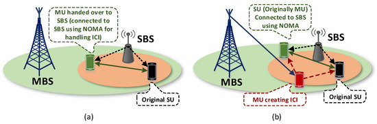 Simulation Scenarios: (a) Interfering MU connected to SBS using NOMA; (b) two NOMA paired SUs with one interfering MU.