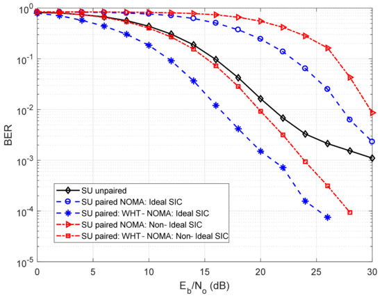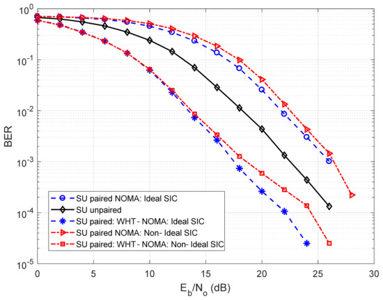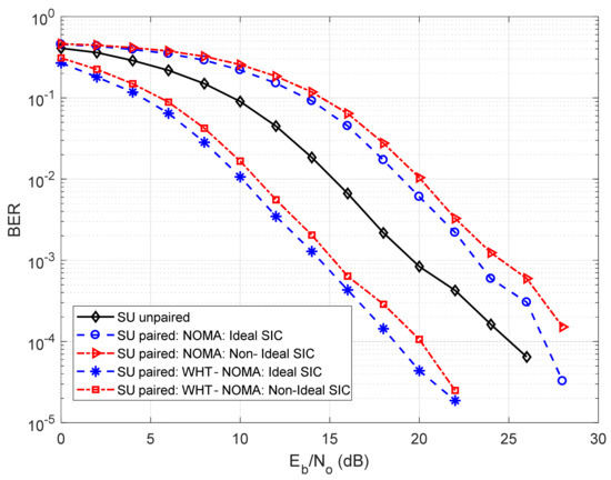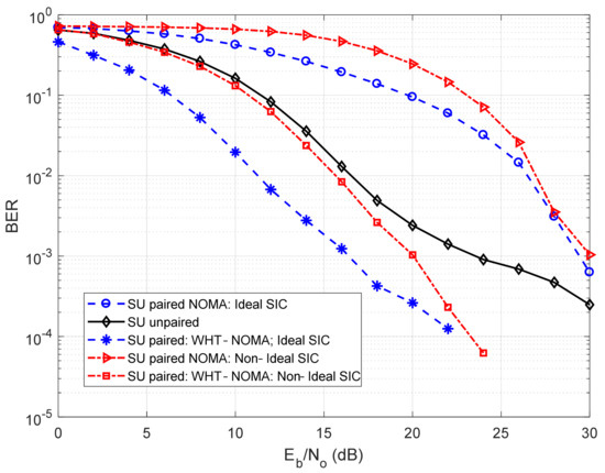 In Figure 6, the results are derived using BPSK modulation. It can be observed from this investigation that using NOMA, the BER performance of SU deteriorates after pairing with the interfering MU, even after performing SIC, compared to its unpaired state. In terms of hybrid-access small-cells, this deterioration is unacceptable as SUs are the owners of the small-cell. Thus, to deal with the situation, WHT is applied to NOMA. It can be observed that using WHT-NOMA, for the paired SUs, there is a performance gain of almost 5–10 dB in SNR for different BER values in both perfect and imperfect SIC conditions compared to the conventional NOMA. Thus, it can be seen that using WHT reduces the BER significantly, resulting in an even better BER performance of the paired SU compared to its unpaired state. A similar trend can be seen in Figure 7, where QPSK modulation is used with the WHT matrix of order 4 ( from Equation (16)).