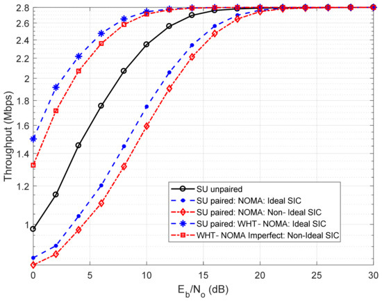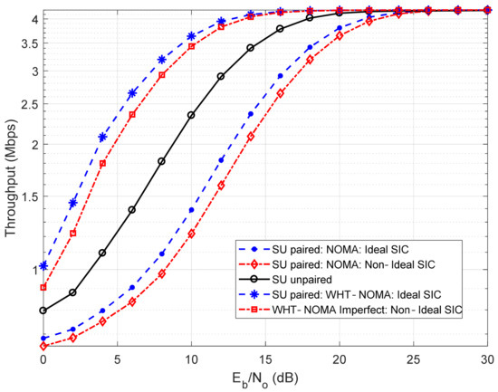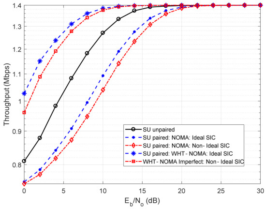The results in Figure 12 and Figure 13 are derived using the higher-order modulation schemes, i.e., QAM and 8-QAM, respectively, and are based on the BER performance shown in Figure 8 and Figure 9, respectively. It can be observed that the trend in throughput performance using WHT-NOMA is similar to the trend followed in Figure 10 and Figure 11. For example, in Figure 13, at 10 dB SNR using WHT-NOMA, compared to conventional NOMA, the throughput of paired SU increases approximately 2.25 Mbps with the ideal SIC and 2.22 Mbps with nonideal SIC. It even exceeds the throughput of its unpaired state, i.e., approximately 1.30 Mbps.