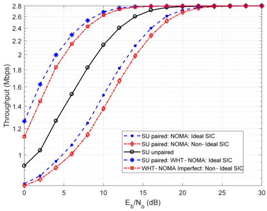 In Figure 10, the results are derived using BPSK modulation. The observation in this figure yields that using NOMA, the throughput performance of SU degrades with pairing, even after performing SIC, compared to its unpaired state. As aforementioned, in hybrid-access small-cells, throughput degradation, because of the nonsubscriber presence, is unacceptable as SUs are the rightful owners or subscribers of the small-cell. Thus, to deal with the situation, it can be seen that using WHT-NOMA, the throughput performance increases in both perfect and imperfect SIC conditions compared to the conventional NOMA. The paired SUs’ performance is even better than its unpaired state. At 10 dB SNR, using WHT-NOMA, compared to conventional NOMA, it can be observed that for paired SU, there is an increase of approximately 0.3 Mbps using the ideal SIC and 0.34 Mbps using nonideal SIC. Furthermore, it can be seen that the paired SUs’ throughput performance compared to its unpaired state also increases using WHT-NOMA, i.e., 0.13 Mbps increase in throughput using ideal SIC and 0.11 Mbps increase using nonideal SIC conditions. A similar trend can be seen in Figure 11, where QPSK modulation is used with the WHT matrix of order 4 ( from (16)).