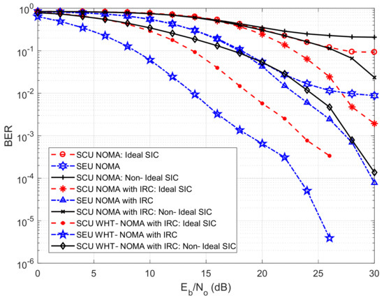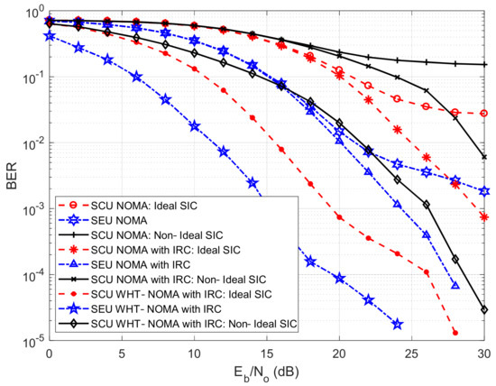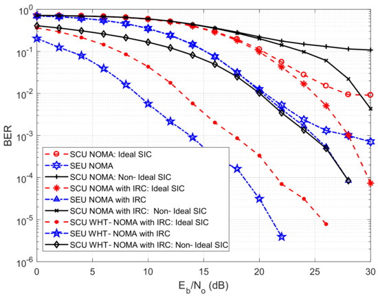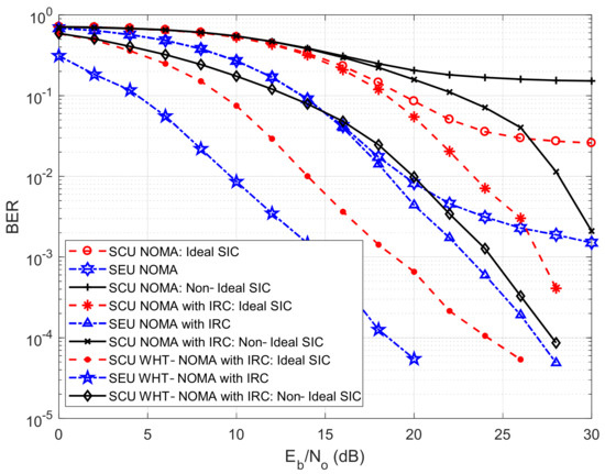 BER performance with IRC using BPSK modulation; NOMA vs. WHT–NOMA, power allocation: SCU = 0.2 and SEU = 0.8.