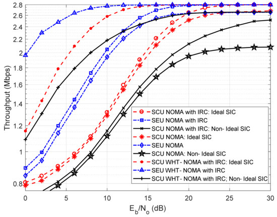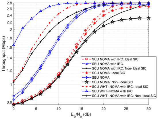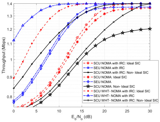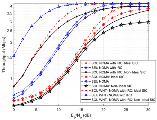 Throughput performance with IRC using BPSK modulation; NOMA vs. WHT–NOMA, power allocation: SCU = 0.2 and SEU = 0.8.