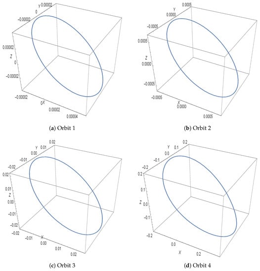 In the following pictures and tables (see Table 1, Table 2 and Table 3 and Figure 1 and Figure 2), we obtain the initial conditions and the period of four periodic solutions for different values of with six decimal number.