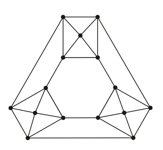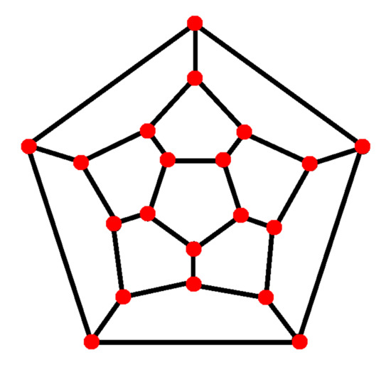 A bijection is an automorphism of G if for each , if and only if . A graph G is called vertex-transitive provided that given any two vertices x and y in , there exists an automorphism of G such that . Note that an automorphism of G preserves the distance between vertices of G. It is known that a vertex-transitive graph is both vertex-degree regular and transmission regular [25]; however, the converse does not hold in general; For instance, the four-vertex-degree regular graph depicted in Figure 2 is 30-transmission regular graph, but not vertex-transitive, since in a vertex transitive graph, all vertices have equal eccentricities, while in this graph, the eccentricity of vertices is 3 or 4 [31], while in a vertex transitive graph, all vertices have equal eccentricities.
