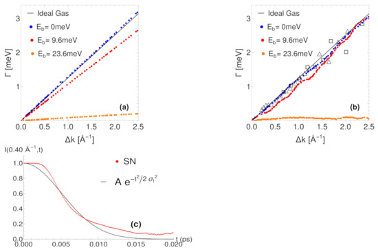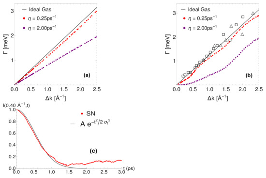 Quasielastic broadening from Equation (44) as a function of surface parallel wave vector transfer for the decay process of the function with a low coverage , surface temperature K and initial adsorbate velocity m/s. Black lines correspond to Equation (45). (a) Numerical simulations for a flat surface ( meV) with friction coefficients ps (red) and ps (purple). (b) Langevin molecular dynamics simulations from Ellis et al. [20]. Experimental results from the QHAS broadening at two incident He beam energies meV (triangles) and meV (squares). (c) The ISF given by Equation (41) is plotted versus the simulation time in ps for and friction coefficient ps. Our simulation results (SN) are represented by the red curve and the fitting Gaussian function by the black curve.
