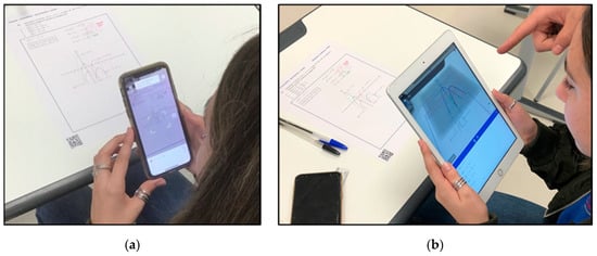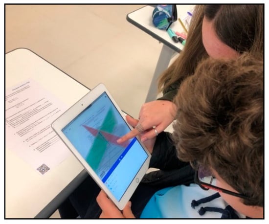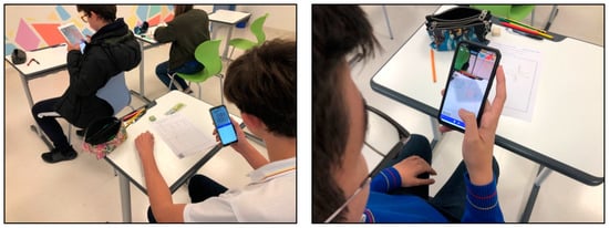 Although students had never used interactive mathematical software in AR as a teaching tool before, Geogebra AR’s smooth learning curve allowed us to design a classroom experience with a discovery-based learning format. Therefore, instead of dedicating teaching sessions to explain the operation, tools, or elements of the program interface, a routine was established in the classroom based on brief instructions and directed activities through proactive and tangible learning that made students gradually master the software according to the demands of each activity, their needs, and inquiry. As in the development of any other training unit, students were assigned tasks to perform outside school hours. The use of the binomial RA-mobile devices allows students to access information regardless of where they are, thus combining classroom work with online work, which results in an educational model closer to the needs of new generations known as b-learning []. This has a greater significance nowadays due to the change of paradigm that the educational system is facing in times of Covid-19, and due to the leading and essential role that technologies have taken, we are facing a scenario in which we must help strengthen self-learning and autonomy in students, as well as motivate them to help capture their interest and enhance their desire to investigate [].