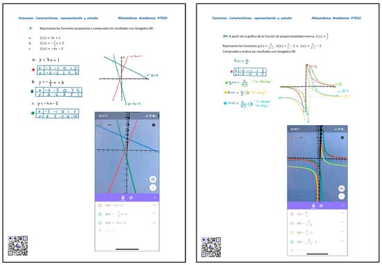 The collection of contents generated deals with aspects such as the representation, study, and analysis of functions such as: Constant, affine, linear, quadratic, absolute value, inverse proportionality, exponential, logarithmic, and trigonometric. These materials were used in paper format (Figure 4), so that the students could solve the activities in written form while superimposing in the work card the graphic representations in AR generated by Geogebra AR. A QR code was located at the bottom of each worksheet, giving access to downloading the application.