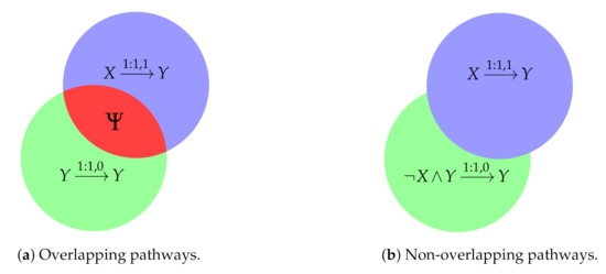 Then, what happens when one activator and one inhibitor coincide in the same node? This is what occurs in Figure 1a for node Y, when X and Y are simultaneously active (). According to the pathways, there is a contradiction because Y would have to be active () and inactive () at the following time step. These contradictions are called conflicts. In this case, the conditions (left side) of the pathways of Equation (7) overlap in a region called , where . Therefore, the conflict emerges when :