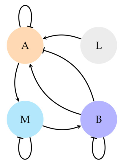 The lac operon dynamics are conveyed in the graph of Figure 6. This graph has been developed from the reduced model of 3 variables shown in Equation (19) [17]. In this model there are three system variables: Allolactose (A), -galactosidase (B), and messenger RNA (M). The rest of parameters are constants [17] except lactose (L), which is an input variable.