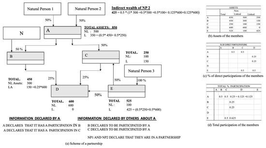 - Calculate the target variable (assets or net worth). We used balance-sheet data declared on Form 200 to output, for each network node, two set of values: (a) linked assets and liabilities; (b) non-linked assets and liabilities (that is, the balance-sheet items that appear due to company participation in other companies) as illustrated in Figure 1 for the example.Now,where is the set of companies in which inhabitant i has a share, is the set of all the paths from i to c and l is a company along the path p.The indirect net worth of a taxpayer’s participation in a company is the sum, for the companies, indexed by c, in which it has a share, and for all the paths, indexed by p, that connect the taxpayer with a company, of the product of % participations multiplied by the non-linked net worth () of these participations in the L companies along a path. The non-linked assets (referred to in Spanish as “no vinculados”) are calculated using data from Forms 200 and 220, including the balance sheet items. A close approximation to the linked value can be calculated from the balance sheet by deducting the value declared under items 00118, 00153, 00160 referring to assets and items 00223, 00238, 00243 referring to group and partner companies from the company assets. It was decided that the value of a taxpayer’s urban property is, in each case, the maximum of three available values: (a) the value declared on Form 714 (Boxes A, A1, C, D and M), the cadastral value of the property plus the value declared on Form 720 [37].