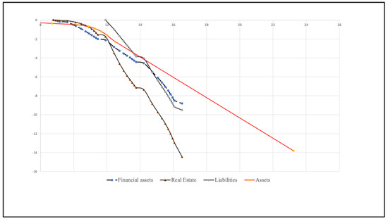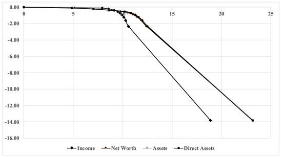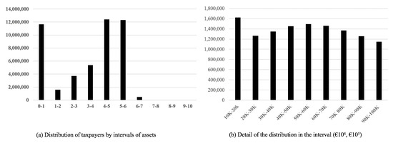 We find that income has a singular behavior, especially in the lower region, because, given the declaration threshold, it is not universally declared, its range of variability is smaller than for wealth, and it is sometimes submitted for household units. The distribution for the other group of variables is similar. If we were to consider net worth, a transformation would be necessary because it has an interval with negative values. There are 4.53 million taxpayers with “negative assets”, most of whom are paying back a mortgage on their home. Many of these taxpayers have income and are not accounted for only when the analyzed variable is “net assets > 0”. Therefore, we concluded that the best option is to study total assets.