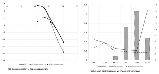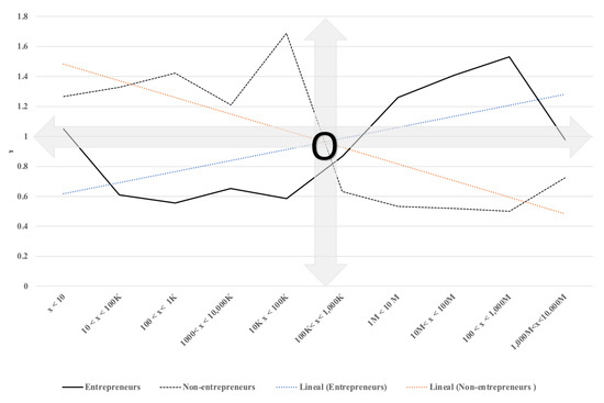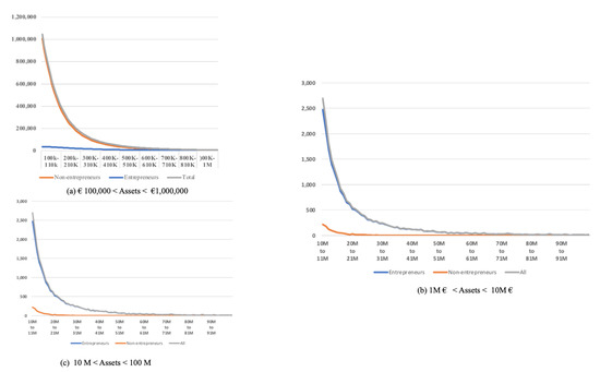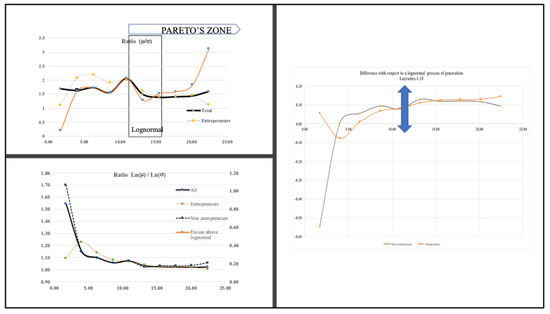 Figure 13 shows the ratio between the theorical and observed for each interval and subpopulation. For example, the value 1.69 in the interval expresses that the value of (€53,382) for the subpopulation of non-entrepreneurs is 1.69 times the value of , that is, €31,623.