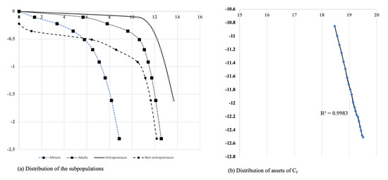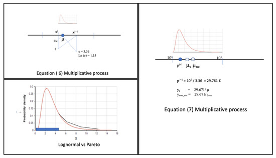 In Figure 12, we develop the idea expressed in Equations (6)–(8). We interpret that the observed values of , greater that the values that should be expected in a multiplicative process, are the expression of the coexistence of one multiplicative process of accumulation of wealth with another that should be observed in absence of non-entrepreneurs, more similar to a Pareto’s distribution.