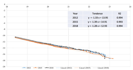 Table 8 shows the values obtained with (7) and (8) obtained to investigate if it is the case that there is a subjacent multiplicative process, using in this case the position of the mean in each interval of wealth.