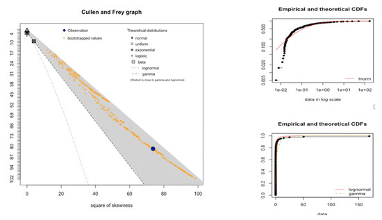 - Lognormal distributionThis type of distribution is intuitively applicable and is endorsed by Gibrat’s research, because the distribution of any manifestation of wealth is universally asymmetrical [42].From another point of view, note that Koch [17,25,43,44,45,46,47,48] observed that asymmetry is a possible exponential trace. The exponential increase in the wealth of the richest could be studied by analogy with biological phenomena [42].