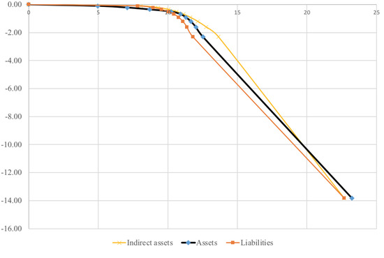 Figure 14 concludes the process initiated in Figure 2. There are three curves: total assets in the middle and indirect assets on the right and liabilities in the left. The methodology explained in Section 2 has found that indirect wealth, the value of the non-listed companies owned by entrepreneurs, accounts a 11.08% of the total wealth in Spain.
