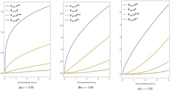 Figure 3 shows the effect of on the fractional accumulated infiltration for several values of . As previously described, is associated with hydrodynamic characteristics of the soil type, where corresponds to a linear soil type solved in [] for . corresponds to the solution given by Talsma and Parlange solved in [] for . Further, Figure 3 shows how the effect of is greater than in determining the value of the fractional cumulative infiltration ; that is, the anomalous soil behavior has a greater impact on the cumulative infiltration compared to the soil type. On the other hand, it can be observed that, for a fixed value of , the extreme values of limit the behavior for cumulative infiltration.